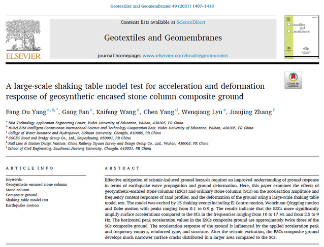【成果速递】BIM技术应用工程中心成员欧阳芳在《Geotextiles and Geomembranes》期刊上发表论文“A large-scale shaking table model test for acceleration and deformation”,该论文为1区SCI,影响因子为5.292。